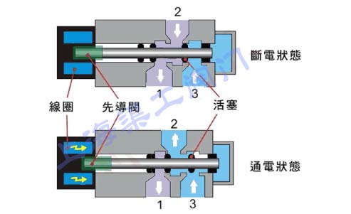 單電控二位三通電磁閥工作原理: 電磁閥激勵(lì)(電磁線圈流過(guò)電流,閥芯在電磁力的作用下移動(dòng),使閥芯壓縮彈簧,并移動(dòng)到右側(cè),3和2口相通,1口封閉) 電磁閥失勵(lì)(電磁閥線圈沒有電流通過(guò),因此,電磁閥的彈簧釋放,將閥芯移動(dòng)到電磁閥的左側(cè),1和2口相通,3口封閉) |