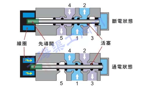 電磁閥失勵(lì)(電磁閥線圈沒有電流通過(guò),因此,電磁閥的彈簧釋放,將閥芯移動(dòng)到電磁閥的左側(cè),1和2口相通,4和5相通,氣源從1口進(jìn)入氣缸,5口排出氣缸里的氣體)